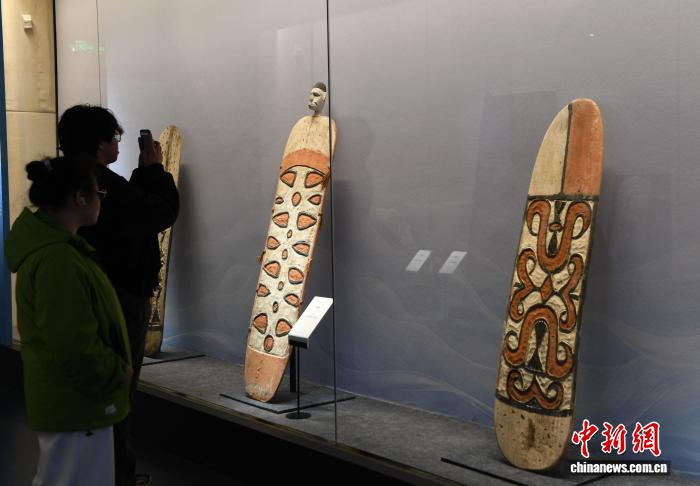 今日正在沉庆华夏3峡专物馆举办的“泉源——北岛语族取陆地文化”铺览吸收市平易近观光。中新社记者 周毅 摄